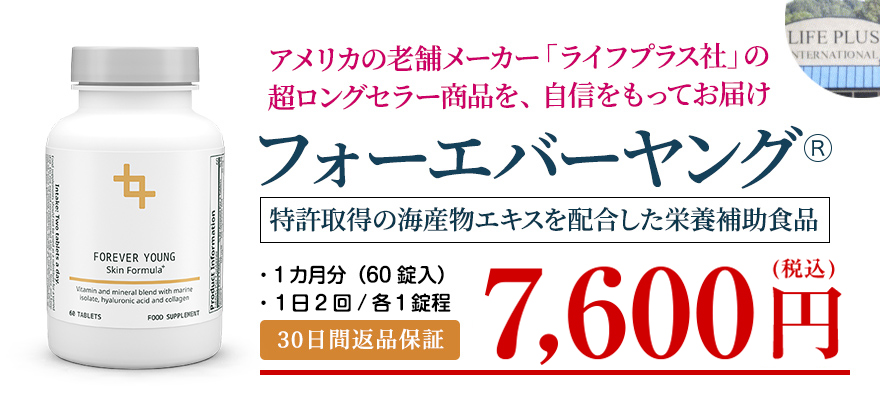 お肌に良い成分も、栄養素単体では体内に吸収されにくく、ほかの栄養素があって初めて体内の細胞レベルまで取り込まれ、その効果を発揮します。 フォーエバーヤングには、海産物栄養素をはじめとした補助作用が期待できる栄養成分がぎっしり詰まっています。
